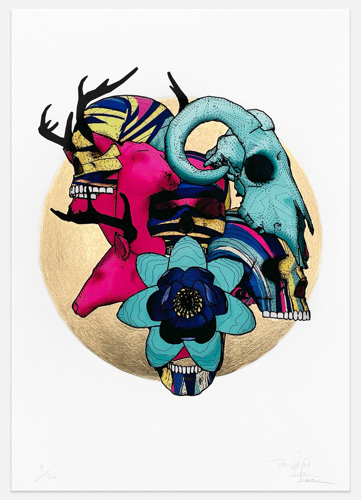 Introducing “Arrogance,” an artwork that explores the theme of our own selfishness, symbolized through the arrangement of human and animal skulls before a striking gold circle. The contrast of the organic and inorganic elements creates a compelling juxtaposition that speaks to the fragility of life and the hubris of humanity.