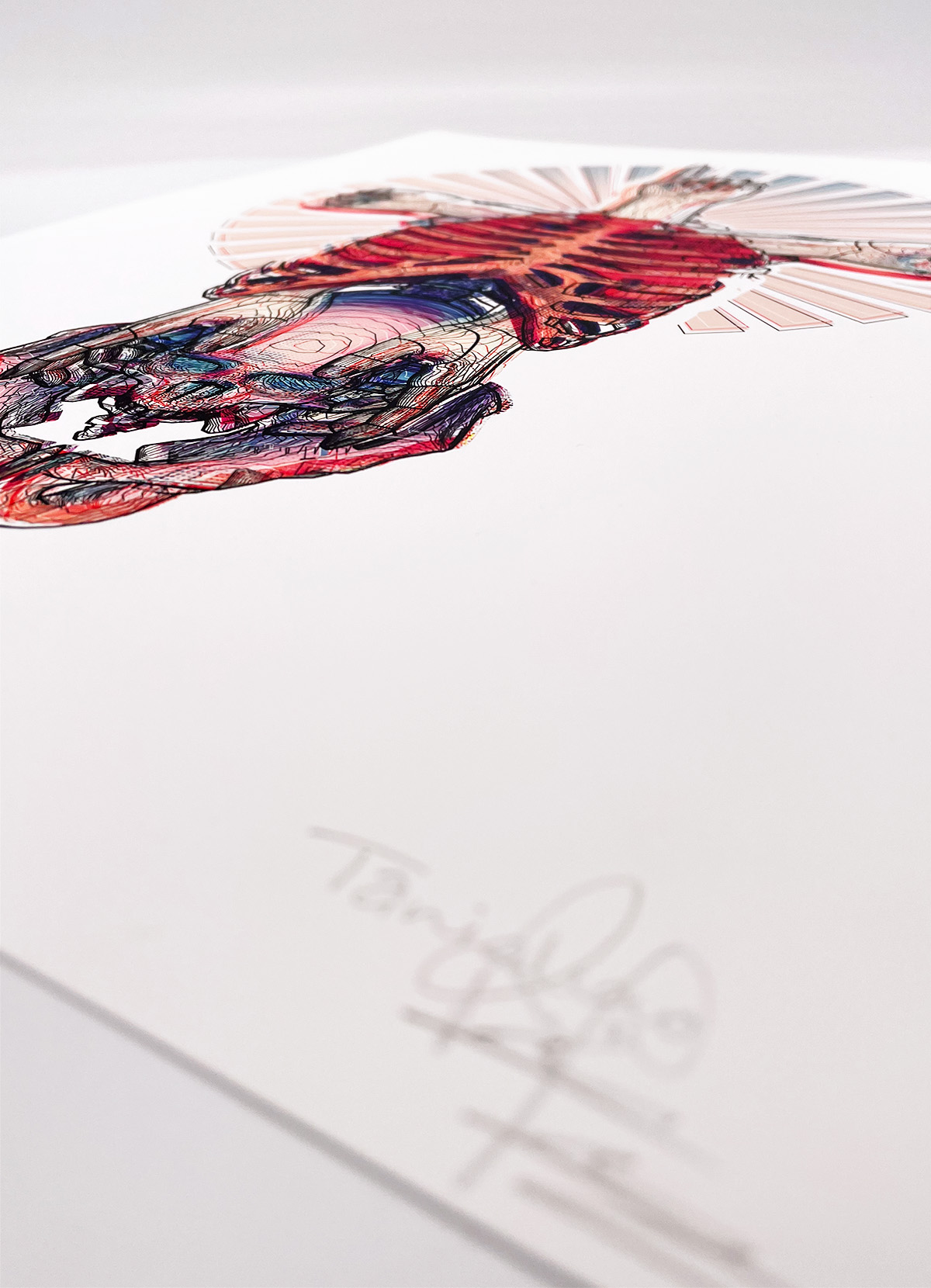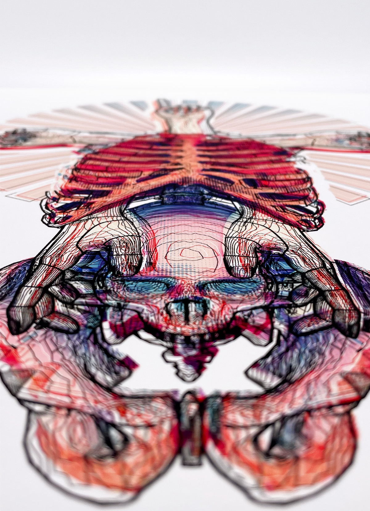 It depicts a cross of five hands protruding from an exposed rib cage and are positioned in such a way as to suggest the power of creation that lies within us.