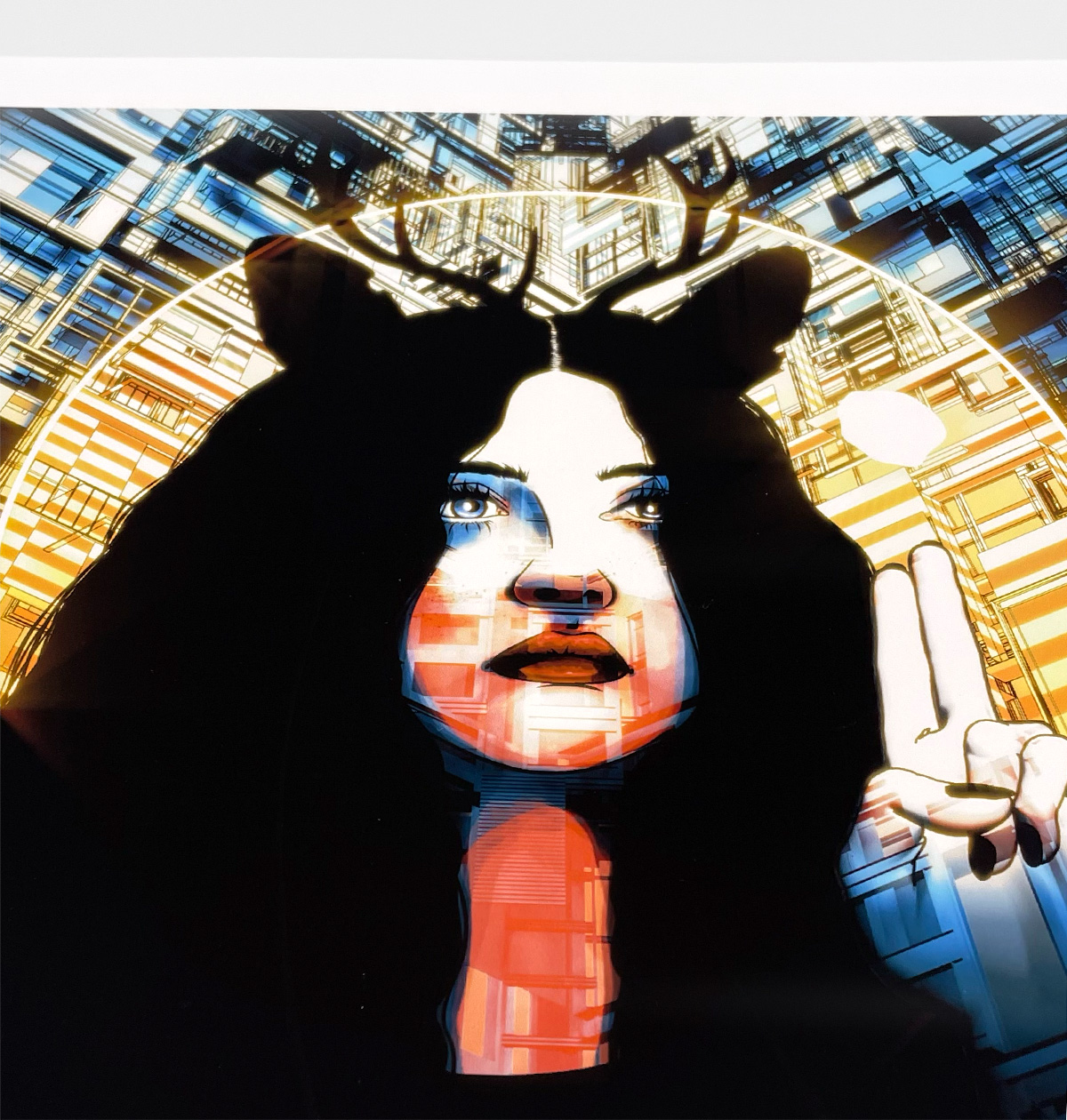 A woman with antlers in front of a never-ending building, pointing upwards towards a small blob of light highlights our theme of nature.