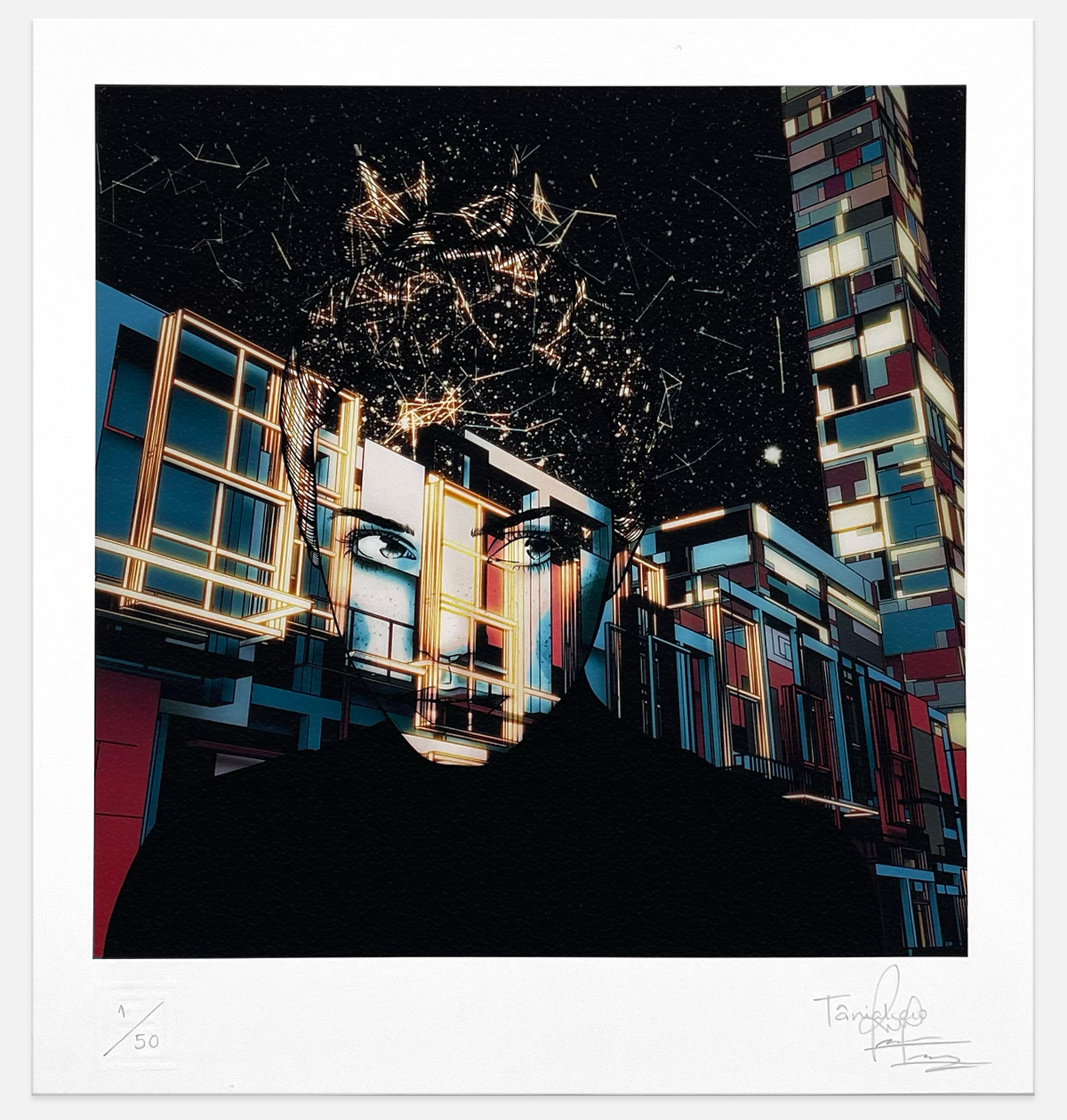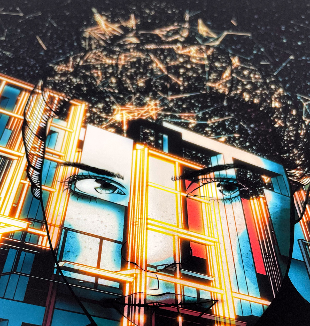 Safe Space is a piece of art where we tried to suggest a longing for safety and security by juxtaposing a woman’s transparent form in front of a passing abstract building at night surrounded by the stars