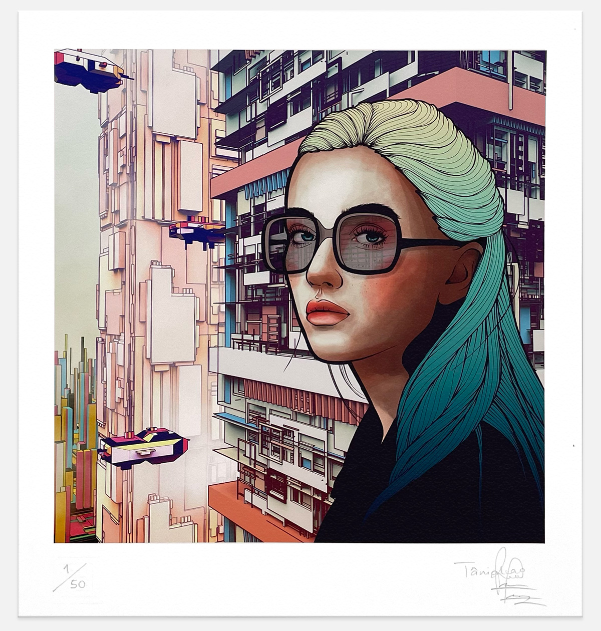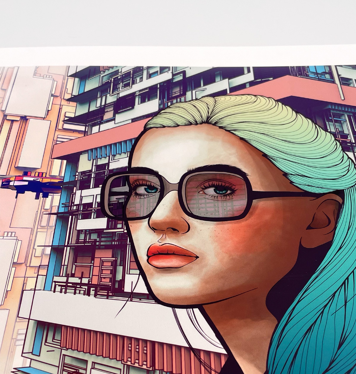 Looking into the glass of the ascending elevator while the frenzied, fast-paced world goes by outside we see a woman’s detached form, highlighting the idea of solitude.